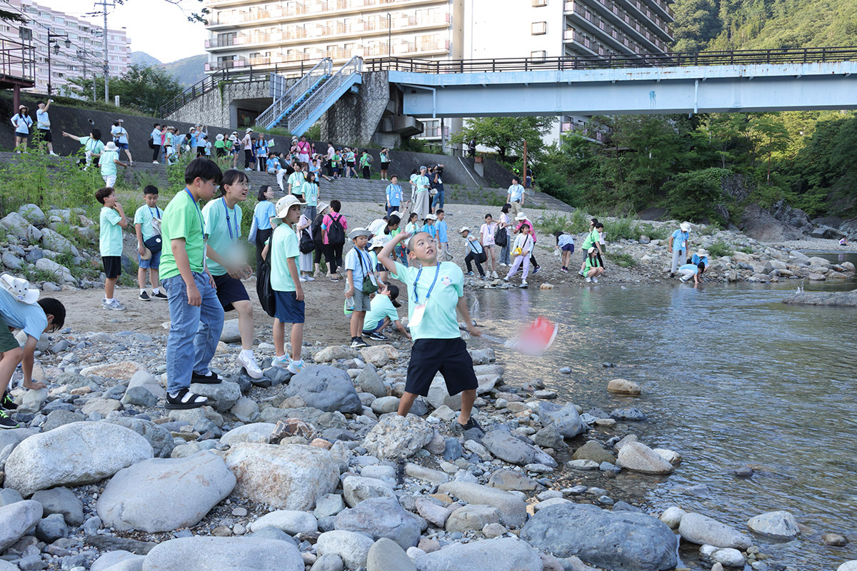 みなかみ町の道の駅「水紀行館」では、利根川水系に棲む魚や生き物を観察し、利根川の流れでつくられた諏訪峡の水辺を散策したり、みんなで小石投げをして遊びました。