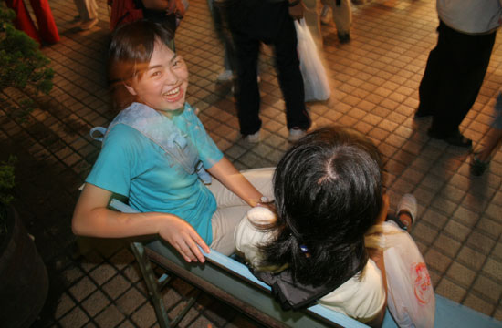 레스토랑의 밖의 벤치에서 저녁 바람을 쐬고 있습니다. 오늘의 이벤트도 즐거웠던 것 같네요. 얼굴 가득 미소가 흘러넘칩니다.